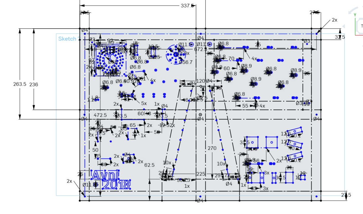 - There's an option of drawing lines which are just visible but not part of the design (Construction geometry). These are great in order to draw all the frame borderlines so you'll know where to draw the parts for cutting. In the next sketch you can see the actual work area on Onshape, where the black lines are visible only and the blue lines are the actual design.